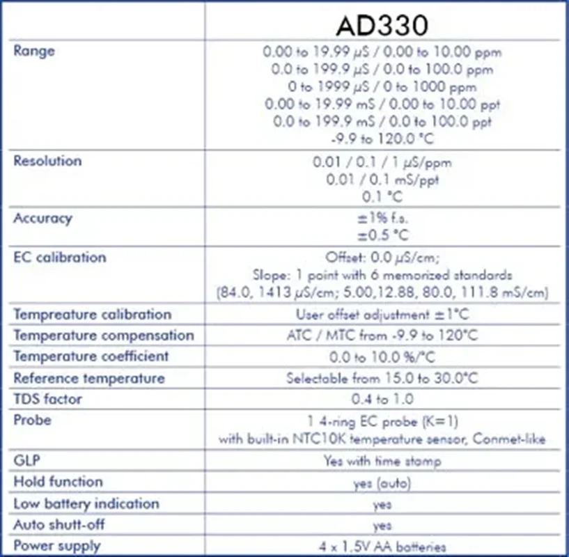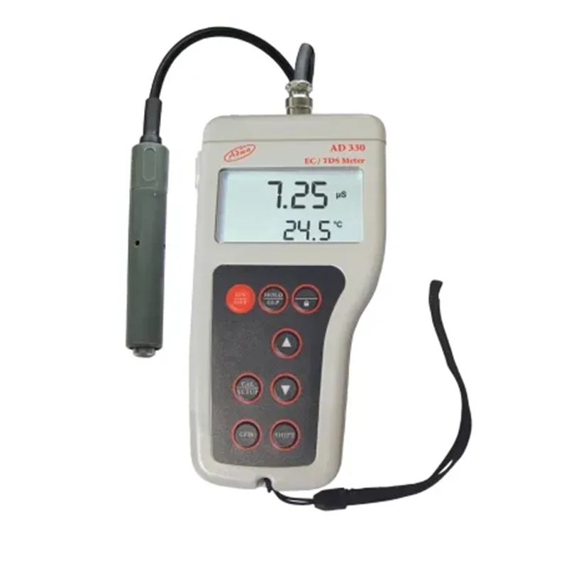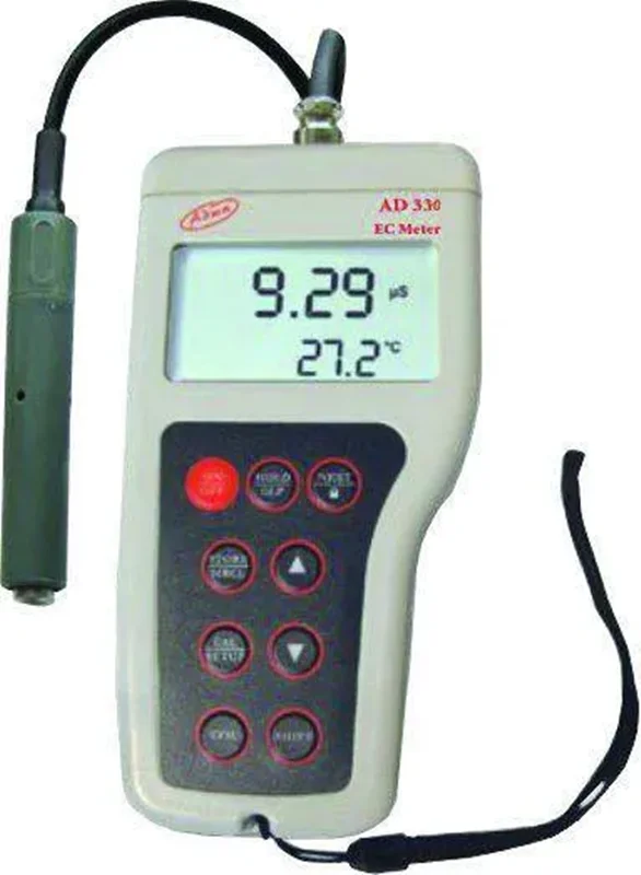 هدایت سنج پرتابل ضد آب آدوا مدل ADWA AD330، یک تستر بسیار دقیق و قوی برای اندازه گیری مقدار EC و TDS محلول می باشد که می تواند مقدار هدایت الکتریکی محلول را در محدوده 00.0μS/cm – 199.9 mS/cm اندازه بگیرید و از آنجایی که در اندازه گیری مقدار هدایت الکتریکی ترکیبات آلی و کلویید های انحلال یافته در محلول قابل سنجش نمی باشند این دستگاه می تواند مقدار TDS Total Dissolved Solids را نیز اندازه بگیرد و سومین پارامتر قابل اندازه گیری توسط این دستگاه دمای محلول است...
