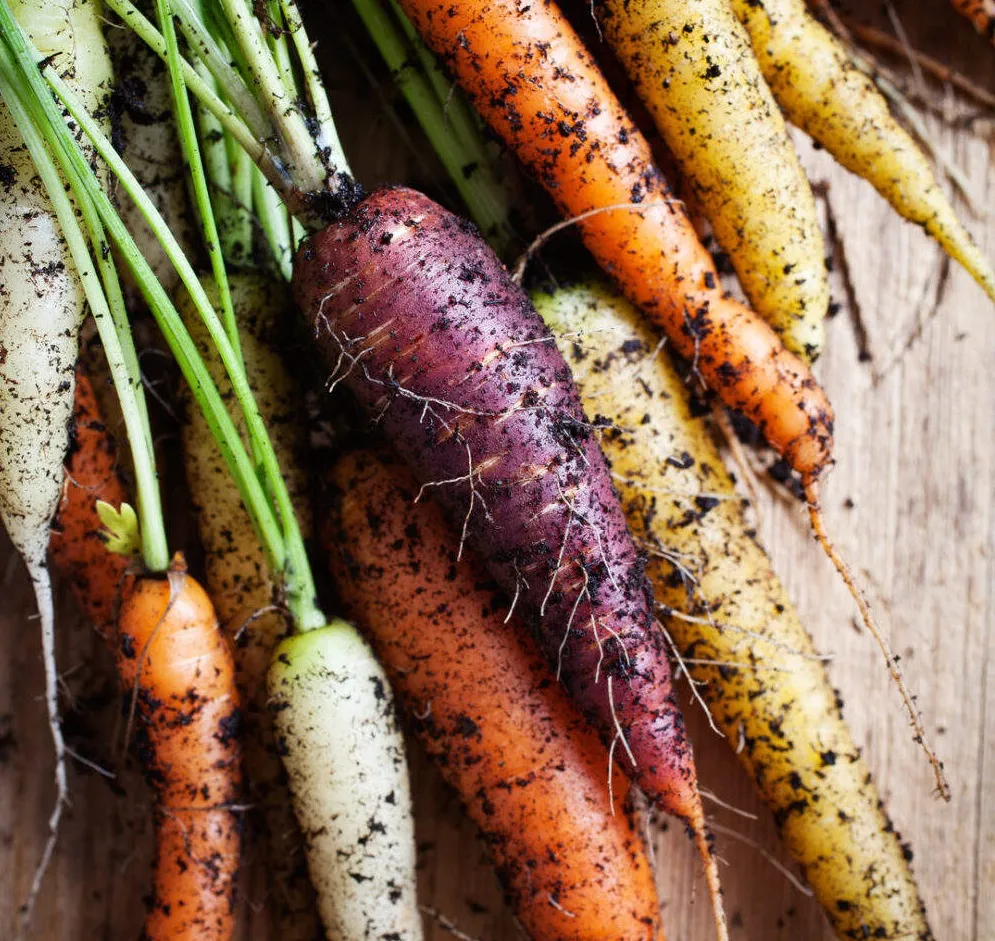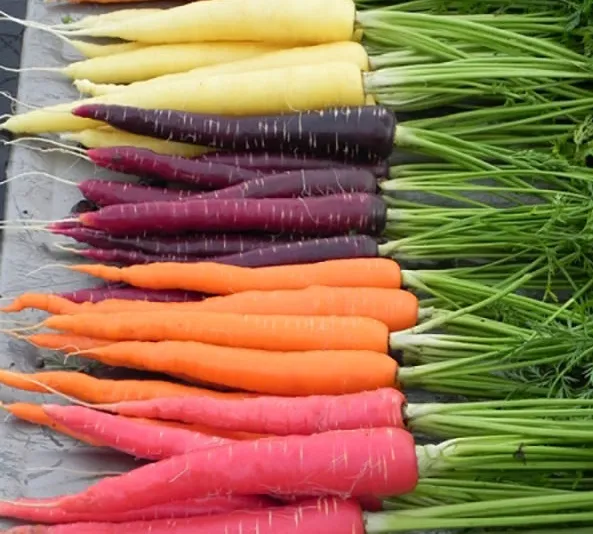 برداشت هویج رنگینکمان مانند حفاری برای یافتن گنج است. تا زمانی که ریشهها را بلند نکنید، هرگز نمیتوانید رنگی را که قرار است ببینید، حدس بزنید. پرورش هویجهای بنفش، قرمز، زرد و سفید بسیار محبوب هستند؛ چرا که بهراحتی رشد میکنند. این هویجها طیفی از انواع رنگ نارنجی هستند اما رنگهای زندهای را به غذاهای خام و پخته اضافه میکنند.