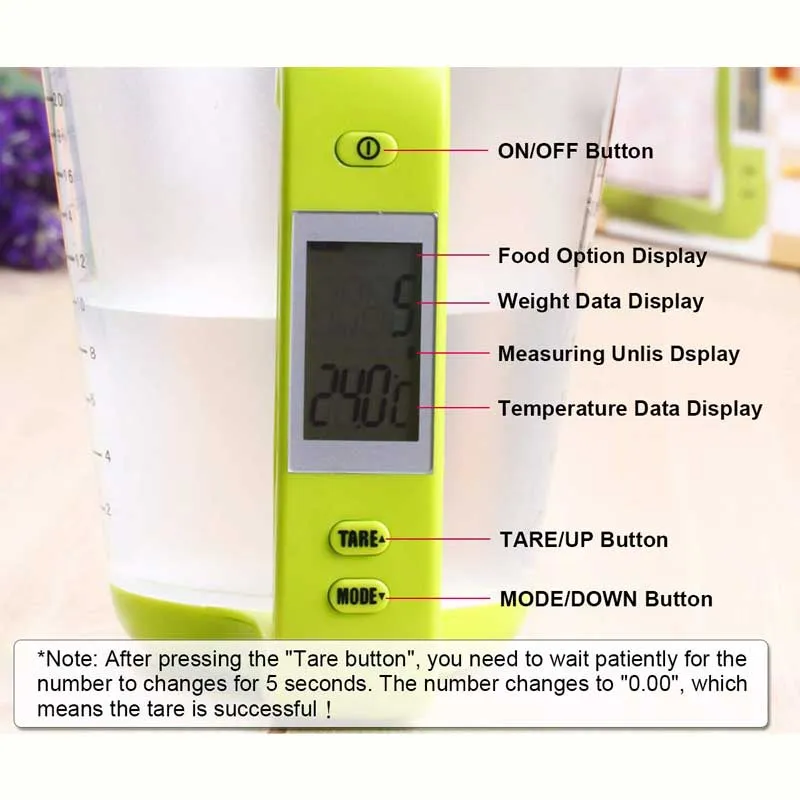 - استفاده از Tare: قبل از افزودن مواد، ظرف را روی دستگاه گذاشته و دکمه Tare را بزنید تا وزن خالص درج شود.
