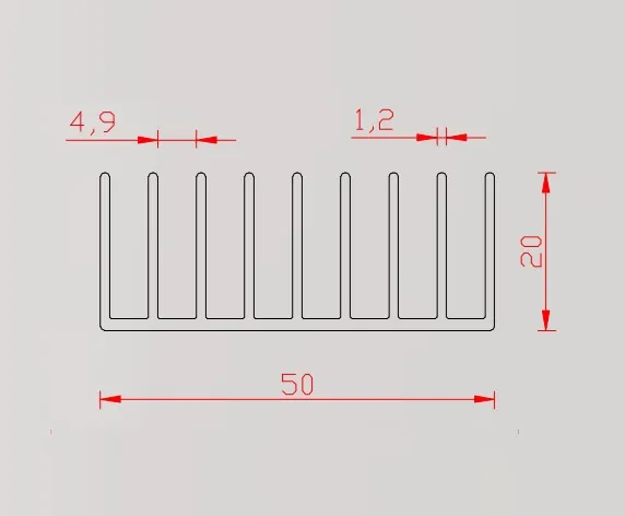 طراحی هیت سینک آلومینیومی عرض 5 سانتی متر شانه 2 سانتی متر (طول 1 متر) به گونهای است که هم عملکرد حرارتی مطلوب و هم نصب آسان را فراهم میکند. شانههای ۲ سانتیمتری جریان هوا را بهینه کرده و تبادل حرارت مؤثر بین قطعات را ممکن میسازد.