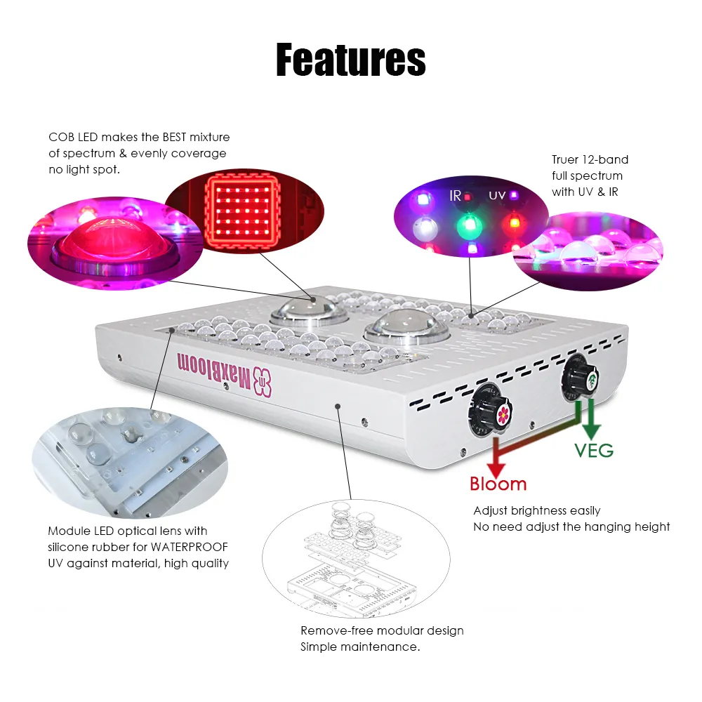پروژکتور رشد گیاه 600 وات کری مکس بلوم Cree MaxBloom، بر خلاف سایر لامپ های ال ای دی رشد گیاه موجود در بازار دارای لامپ های IR و UV می باشد و شبیه ترین طیف نشری به خورشید را در اختیار گیاهان کشت شده قرار می دهد و از رشد علفی و طویل شدن فاصله میانگره ها جلوگیری می کند و در گیاهان گلده و میوه القا کننده گلدهی در گیاه خواهد بود.