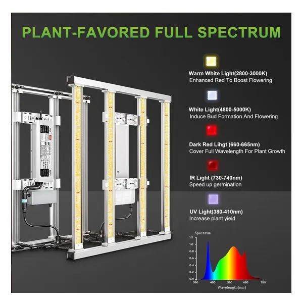 - طیف نوری لامپ رشد گیاه 410-380nm 665-660nm 740-730nm 3000-2800k 5000-4800k است.