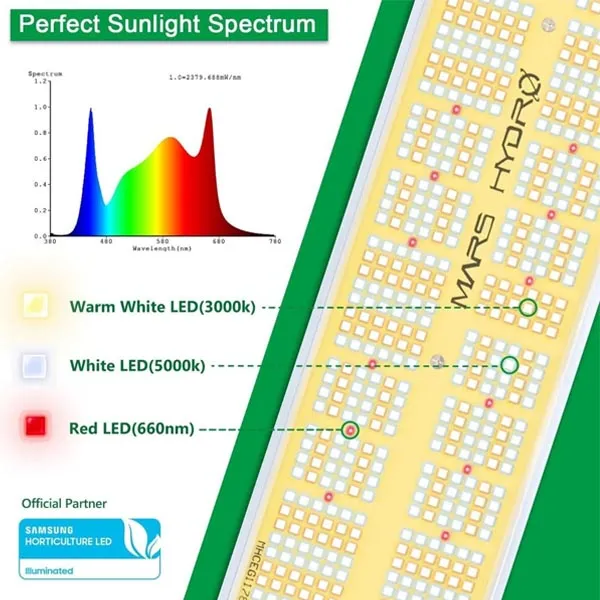 - پروژکتور ال ای دی رشد گیاه مارس هایدرو دارای چیپ های سامسونگ LM301B است که کیفیت بالایی دارند و بالاترین میزان PPF را منتشر می کنند.