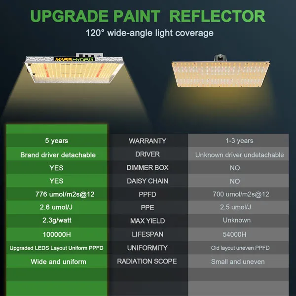 - میزان PPF و PPE نشان می دهد بازده و کارایی پروژکتور رشد گیاه مارس هایدرو تی اس دبلیو 2000 زیاد است.
