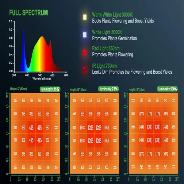 - طیف نوری این لامپ رشد 665-660nm 740-730nm 3200-3000k 6500-6000k است.