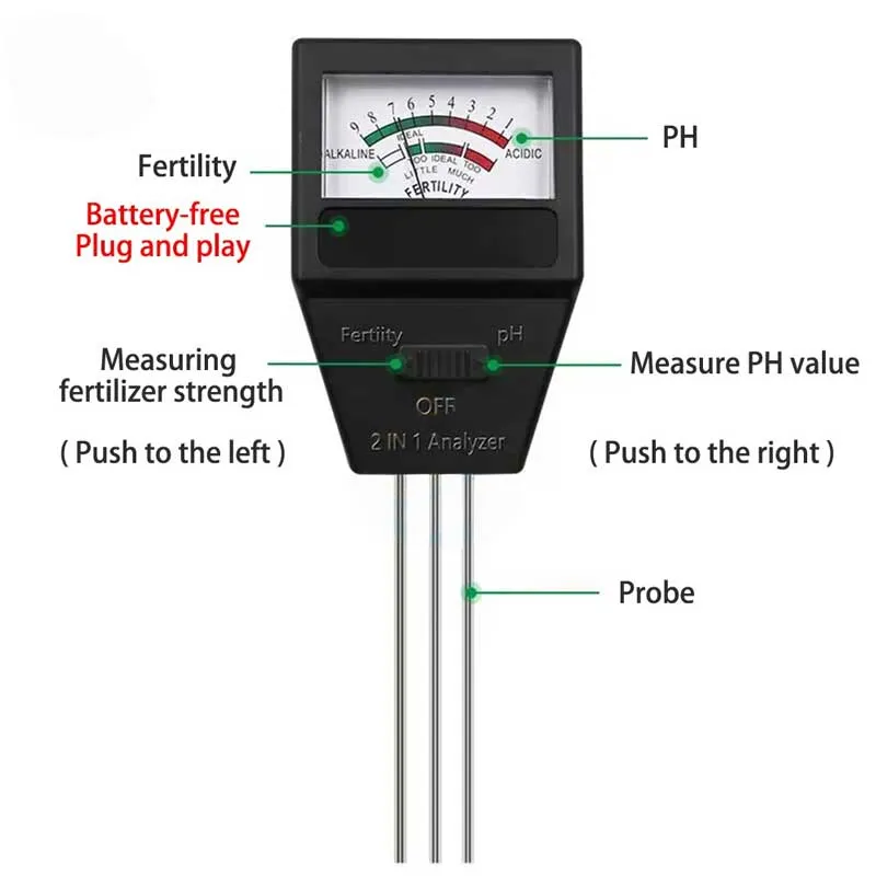 - اندازهگیری pH خاک: میزان اسیدی یا قلیایی بودن خاک برای رشد گیاهان اهمیت زیادی دارد. بیشتر گیاهان در pH بین ۵.۵ تا ۷ رشد بهتری دارند. این دستگاه به شما امکان میدهد تا به راحتی این پارامتر را بررسی کنید.
