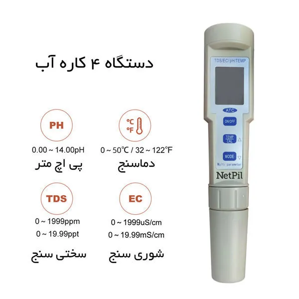 PH متر قلمی ۴ کاره نت پیل EZ9908 قابلیت اندازهگیری چهار پارامتر کلیدی را دارد که شامل PH (اسیدیته)، EC (شوری الکتریکی)، TDS (مجموع مواد محلول) و دما میشوند. این دستگاه با ارائه دادههای دقیق برای هر یک از این پارامترها، امکان تحلیل کامل کیفیت آب و محلولهای شیمیایی را فراهم میکند. با اندازهگیری PH میتوان اسیدیته یا قلیائیت محلولها را بررسی کرد، با EC میزان هدایت الکتریکی و شوری آب ارزیابی میشود، با TDS کل مواد محلول در آب مشخص میگردد و اندازهگیری دما به کاربر کمک میکند تا شرایط فیزیکی محیط نمونهگیری را نیز کنترل کند. این قابلیت چندکاربردی باعث میشود که کاربران بتوانند با یک دستگاه، تمامی پارامترهای حیاتی را تحت نظر داشته باشند و دیگر نیازی به ابزارهای متعدد نباشد.