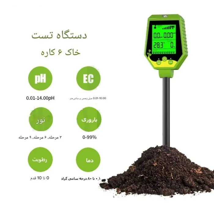 با پی اچ متر 6 کاره خاک حرفهای، باغبانی به سطح جدیدی از دقت و کارایی میرسد! این دستگاه پیشرفته با قابلیت اندازهگیری دقیق پی اچ، رطوبت، دما و مواردی دیگر، اطمینان میدهد که گیاهان شما همیشه در بهترین شرایط رشد کنند. انتخاب ایدهآل برای کشاورزان و علاقهمندان به باغبانی! همین حالا تهیه کنید و سلامت باغ خود را تضمین کنید!