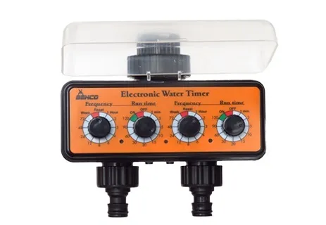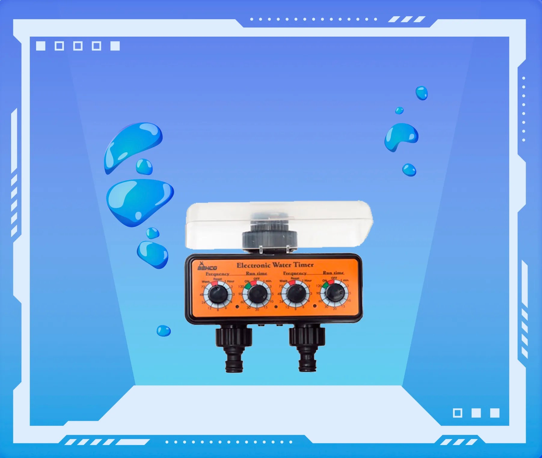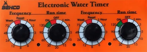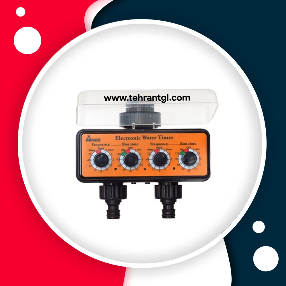 تایمر آبیاری قطعه ای مکانیکی یا دیجیتال است که عملیات آبرسانی به گیاهان را به صورت برنامه ریزی شده و اتومات بدون دخالت نیروی انسانی انجام می دهد. تایمر آبیاری دو کاناله بهکو ساخت کشور تایوان و تحت لیسانس شرکت بهکو ایران می باشد. این تایمر دارای دو کانال خروجی آب با قابلیت برنامه ریزی جداگانه این امکان را فراهم می کند که دو ناحیه مختلف را با دو برنامه متفاوت آبرسانی کرد. هر کانال خروجی دارای دو پیچ ولوم یکی جهت تعیین دوره ی آبیاری که از یک ساعت تا یک هفته می باشد و دیگری جهت تنظیم مدت زمان آبیاری ست که از یک دقیقه تا 120 دقیقه می توان تنظیم کرد.