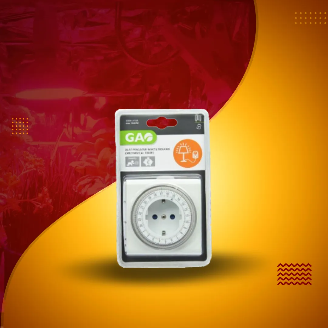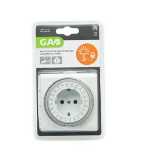 تایمر پریز دار آنالوگ GAO دارای گردونه مدرج 24 ساعته است که 12 ساعت روز با رنگ سفید و 12 ساعت شب با نوار مشکی مشخص شده است. دستگاه شامل 96 پین است که هر پین معادل 15 دقیقه زمان میباشد. این ویژگیها امکان ایجاد برنامههای دقیق برای روشن و خاموش شدن دستگاهها را فراهم میکند و حداکثر 96 برنامه را میتوان برای هر شبانه روز تنظیم کرد.