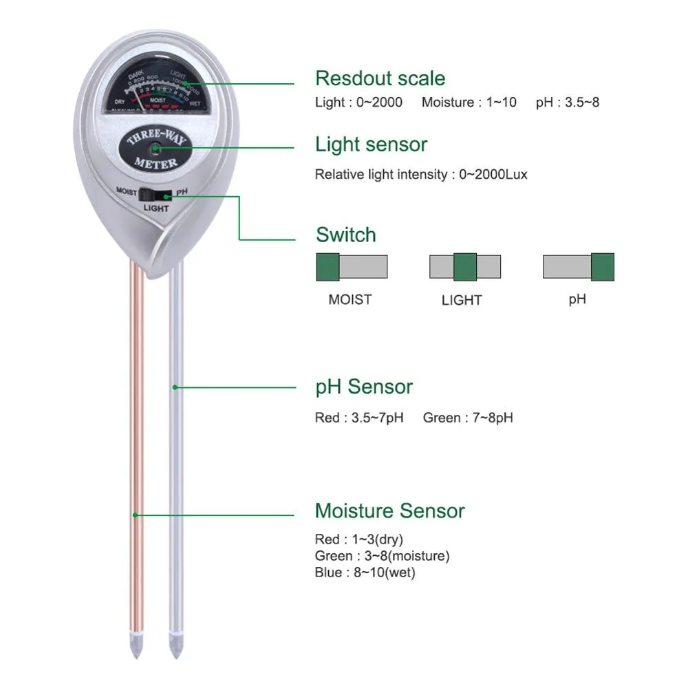 پی اچ متر سه کاره خاک 3 دستگاه در یک دستگاه خلاصه شده است. این پی اچ متر 3 کاره خاک دارای قابلیت سنجش PH خاک در 12 سطح از محدوده 3.5 (اسیدی ترین سطح ) تا 9 (قلیایی ترین سطح) و همچنین قابلیت سنجش رطوبت خاک در 5 سطح بسیار خشک، خشک، کم رطوبت، مرطوب و خیس و قابلیت سنجش سطح نور محیط در 9 سطح از 0 تا 2000 لوکس نوری می باشد. پی اچ متر 3 کاره خاک به صورت آنالوگ یا عقربه ای می باشد و بسیار سبک و قابل حمل بوده و به راحتی می توان از آن استفاده کرد...