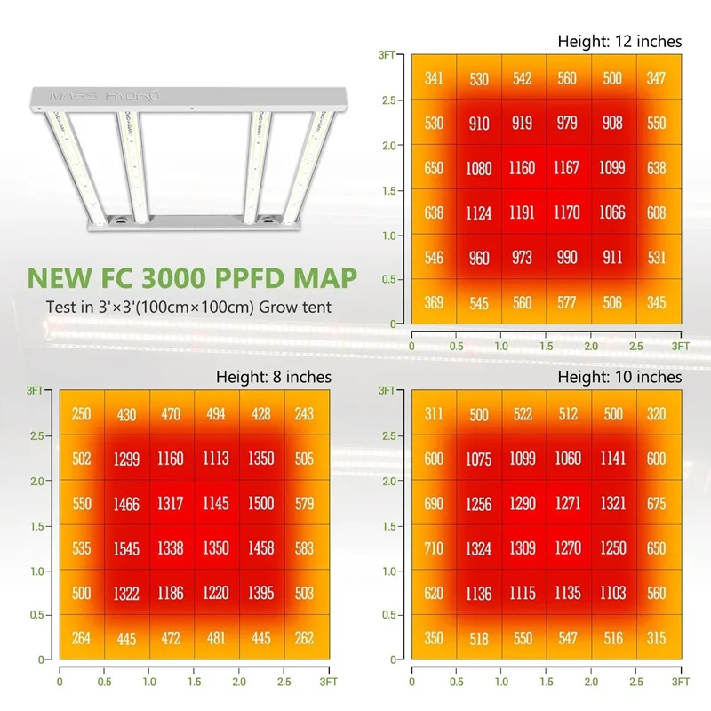 پروژکتور ال ای دی رشد گیاه مارس هایدرو اف سی 3000 دارای مصرف انرژی پایین بوده و از لحاظ گرما و بازدهی از بهترین راندمان انرژی برخوردار است. این محصول می تواند ابعاد یک متر مکعب را به خوبی پوشش دهد. دارای تمامی استانداردهای فنی و برقی لازم برای رشد گیاهان می شود. میزان ولتاژ و جریان لازم برای عملکرد مناسب آن معادل 303w است. اگر بخواهیم در یک نگاه ویژگی های پروژکتور رشد گیاه Mars Hydro مدل FC3000 را بیان کنیم به شرح زیر خواهد بود: