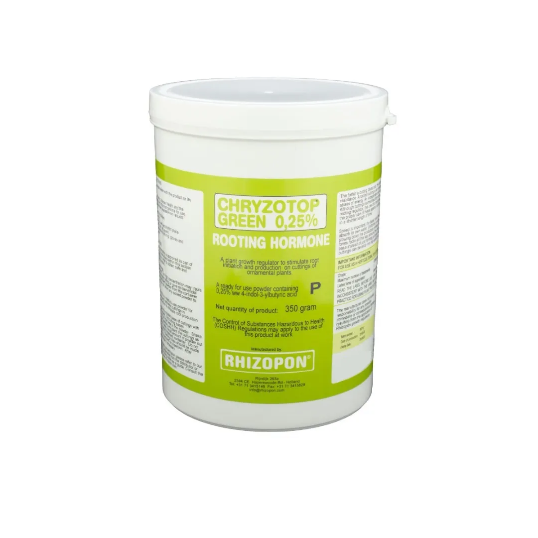 هورمون ریشه زایی کریزوتوپ سبز 0.25 درصد یک محصول تخصصی و باکیفیت از کمپانی معتبر Rhizopon در آمستردام هلند است که برای تسریع روند ریشه زایی قلمههای گیاهان علفی و خشبی (چوبی) طراحی شده است. این محصول با استفاده از 0.25 درصد ایندولیل بوتیریک اسید (IBA)، یک هورمون مصنوعی اکسین، توانایی تحریک تقسیم سلولی و رشد سریع ریشهها را در قلمهها دارد. به کمک هورمون ریشه زایی کریزوتوپ سبز 0.25 درصد، فرآیند ریشه دار کردن گیاهان دشوار و دیر ریشه زا به سهولت و سرعت بیشتر انجام میشود.