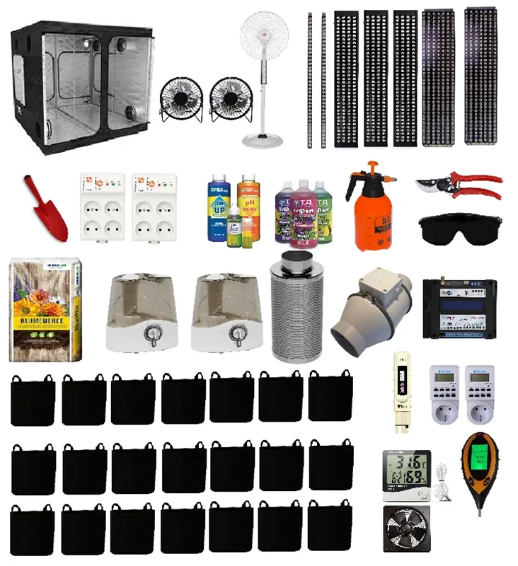 پکیج کامل کاشت تا برداشت 20 گلدان یک مجموعه کامل و تخصصی از تمام ابزارآلات کشت گیاه و تجهیزات قابل نصب برای یک گروباکس حرفه ای مطابق با آنالیزهای تخصصی است که شامل یک اتاق کشت تمام رفلکتور به طول 4 متر و عرض 4 در ارتفاع 2 متر و 2 پنل 750 وات خطی و 3 پنل 430 وات هوشمند و 2 پنل 110 وات خطی جهت تامین نورمصنوعی برای رشد گیاه از مرحله کاشت بذر تا مرحله برداشت محصول می باشد. 20 گلدان پارچه ای با کیفیت و 500 لیتر خاک میکس هلندی ارگانیک و 3 بطری نیم لیتری از کود 3 دوره اصلی ژنرال فلورا جهت تغذیه گیاه در مراحل مختلف رشد،1 عدد بیلچه و قیچی باغبانی و عینک UV و 1 عدد سم پاش ،1 عدد سختی _دما سنج، 2 عدد تایمردیجیتال ، 1 عدد کنترلر اتاق کشت ،1 عدد PH متر4 کاره خاک و آب ، 1 عدد رطوبت _ دماسنج دیجیتال ،2 دستگاه رطوبت ساز سرد 4 لیتری ، 1 عدد فیلتر کربن 40 سانتی و1 عدد جت فن دور بالا ، 1 عدد فن 25 در 25 فلزی دمنده ، یک پنکه ایستاده و 2 پنکه گیره ای ،2 عدد محافظ برق و 100 میلی لیتر بافرکاهنده جهت کاهش و تثبیت محلول های هیدروپونیک می باشد.