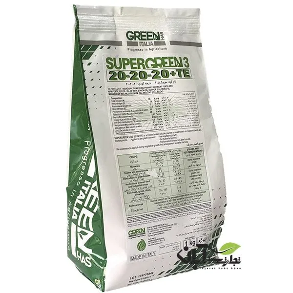 کود سوپر گرین 3 Super Green همانطور از عددها مشخص است حاوی نسبت متعادلی از عناصر پر مصرف مانند نیتروژن، فسفر و پتاسیم می باشد که هر یک به میزان ۲۰ درصد در این کود موجود است.این محصول با کیفیت فوق العاده بالا ، حاوی تمامی عناصر درشت مغذی و ریز مغذی (ماکرو و میکرو) مورد نیاز گیاه می باشد.